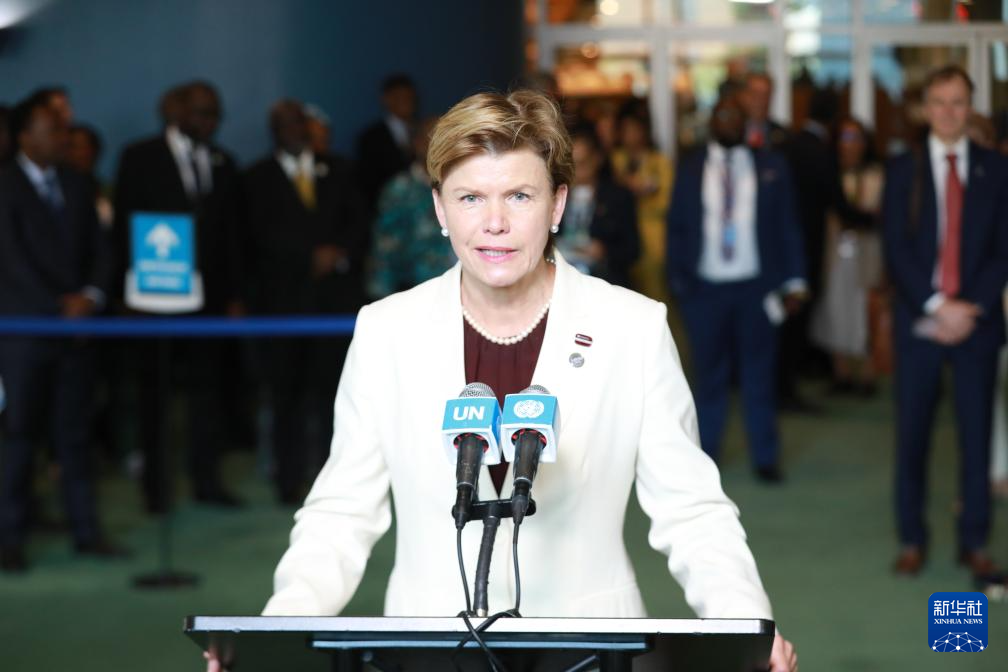 6月3日,在位于紐約的聯(lián)合國總部,拉脫維亞外長拜芭·布拉澤在拉脫維亞當(dāng)選聯(lián)合國安理會(huì)非常任理事國后講話。新華社記者 謝鍔 攝