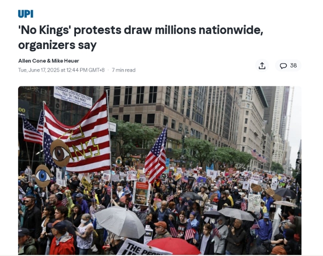 據(jù)美國(guó)合眾國(guó)際社(UPI)6月17日?qǐng)?bào)道,上個(gè)周末,全美多地爆發(fā)約2000場(chǎng)名為“不要國(guó)王”(No Kings)的抗議活動(dòng),組織者稱參與人數(shù)達(dá)數(shù)百萬(wàn)。