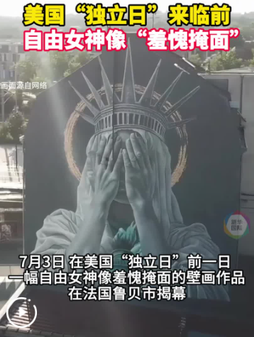 7月3日,在美國“獨(dú)立日”到來前一日,一幅自由女神像羞愧掩面的壁畫作品在法國魯貝市揭幕。