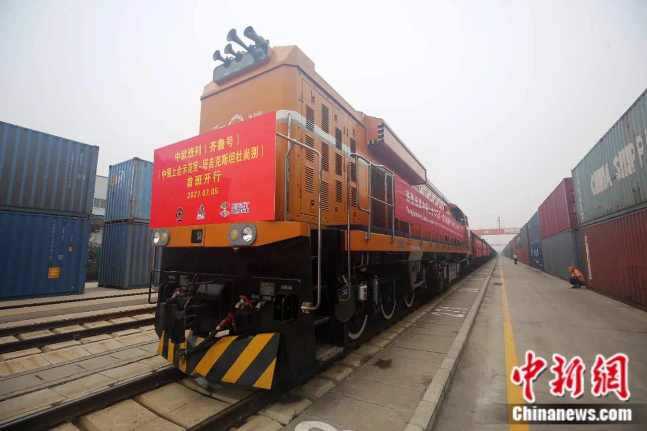 2021年7月5日, 中國—上海合作組織地方經(jīng)貿(mào)合作示范區(qū)(簡稱“上合示范區(qū)”)前往塔吉克斯坦首都杜尚別的首班中歐班列(齊魯號)“上合快線”發(fā)出,從上合示范區(qū)青島多式聯(lián)運(yùn)中心啟程。中新社記者 胡耀杰 攝