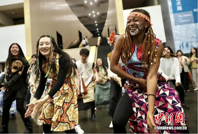 2025年4月27日,清華大學(xué)藝術(shù)博物館在北京舉辦了一場(chǎng)以非洲音樂(lè)舞蹈藝術(shù)為主題的公共教育活動(dòng)。圖為演員和觀眾一同跳舞。 中新社記者 易海菲 攝