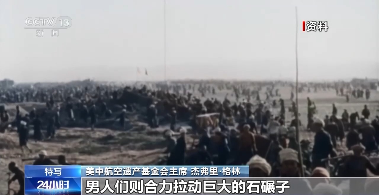 美中航空遺產(chǎn)基金會主席 杰弗里·格林:婦女們背上背著孩子,坐在地上把大石塊敲成小石子;孩子們再把小石子撿到指定地點(diǎn);男人們則合力拉動(dòng)巨大的石碾子,有時(shí)候要100個(gè)人才能拉動(dòng)一臺10噸重的石碾子,就為了把跑道壓平整。無論是寒冬還是酷暑,婦女們敲碎的每一塊石頭,都是在為機(jī)場出力,為飛機(jī)起降創(chuàng)造條件,讓美國飛行員能順利升空抗擊日軍。這背后是一種信念:他們所做的一切都在為勝利搭建基礎(chǔ)。
