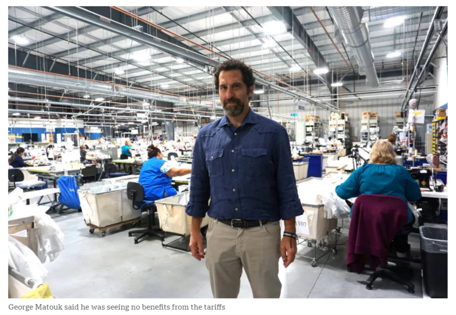馬圖克表示,從今年4 月到 8 月,關(guān)稅導(dǎo)致其每月增加超過(guò) 10 萬(wàn)美元的成本,因?yàn)楦哳~關(guān)稅影響了來(lái)自印度和葡萄牙的棉布、來(lái)自列支敦士登的羽絨等原材料的供應(yīng)。不僅如此,增加的成本還迫使企業(yè)削減了在新設(shè)備以及營(yíng)銷(xiāo)方面的開(kāi)支。喬治 馬圖克說(shuō),他“沒(méi)有從關(guān)稅中看到任何好處”。