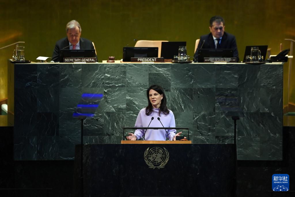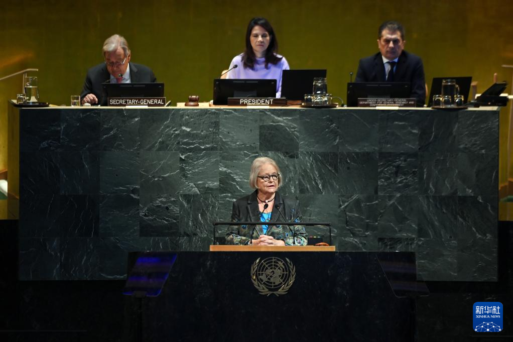 9月22日,在位于紐約的聯(lián)合國總部,第80屆聯(lián)合國大會主席安娜萊娜·貝爾伯克(前)在紀念聯(lián)合國成立80周年高級別會議上講話。新華社記者 李睿 攝