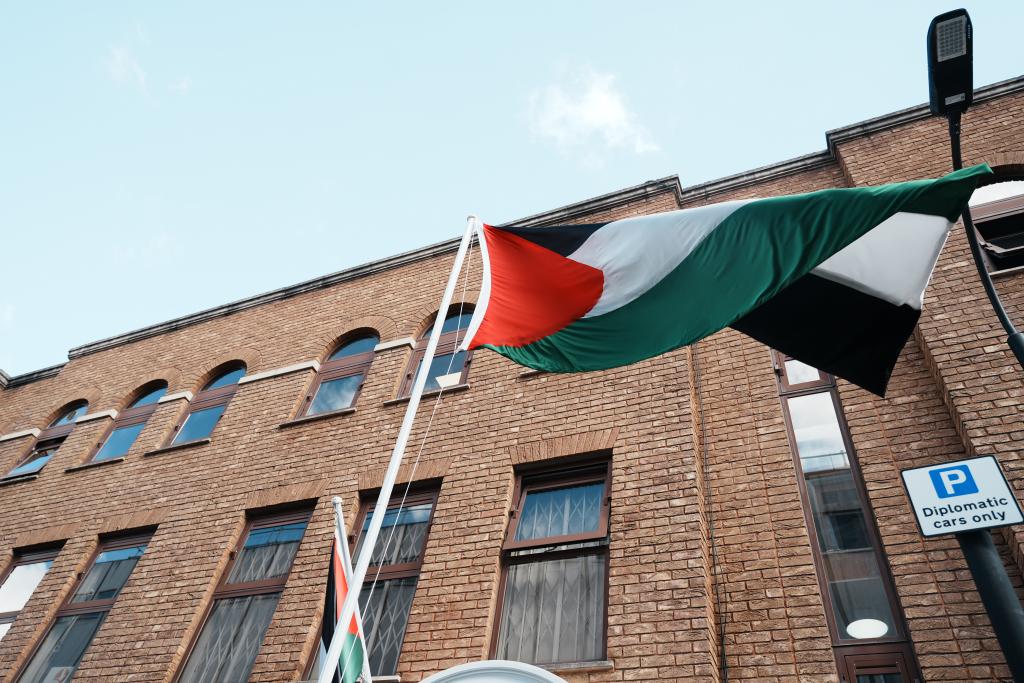 9月22日,巴勒斯坦駐英國(guó)代表處在其倫敦辦公區(qū)外升起巴勒斯坦國(guó)國(guó)旗。新華社記者 趙家淞 攝