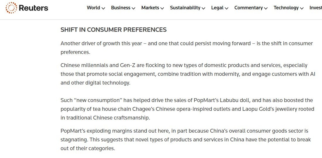 作者認為,中國經(jīng)濟增長的另一個驅(qū)動力是消費者偏好的轉(zhuǎn)變。中國千禧一代和 Z 世代正涌向新型國內(nèi)產(chǎn)品和服務,那些可以促進社會參與、將傳統(tǒng)與現(xiàn)代相結(jié)合、并通過人工智能和其他數(shù)字技術(shù)吸引客戶的產(chǎn)品和服務尤其受到歡迎,這種“新消費”推動了泡泡瑪特拉布布娃娃的銷售,也提升了茶館連鎖店“霸王茶姬”的中國戲曲主題門店和一些源于中國傳統(tǒng)工藝的珠寶的知名度,不僅如此,這些新興的產(chǎn)品和服務類型還具備潛力,能夠突破現(xiàn)有類別。