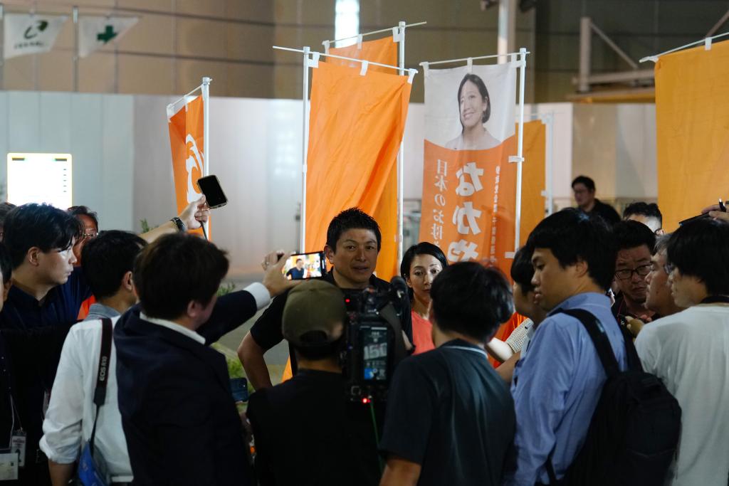 7月13日,在日本千葉縣,參政黨黨首神谷宗幣(中)在街頭演說活動(dòng)后接受媒體采訪。新華社記者賈浩成攝