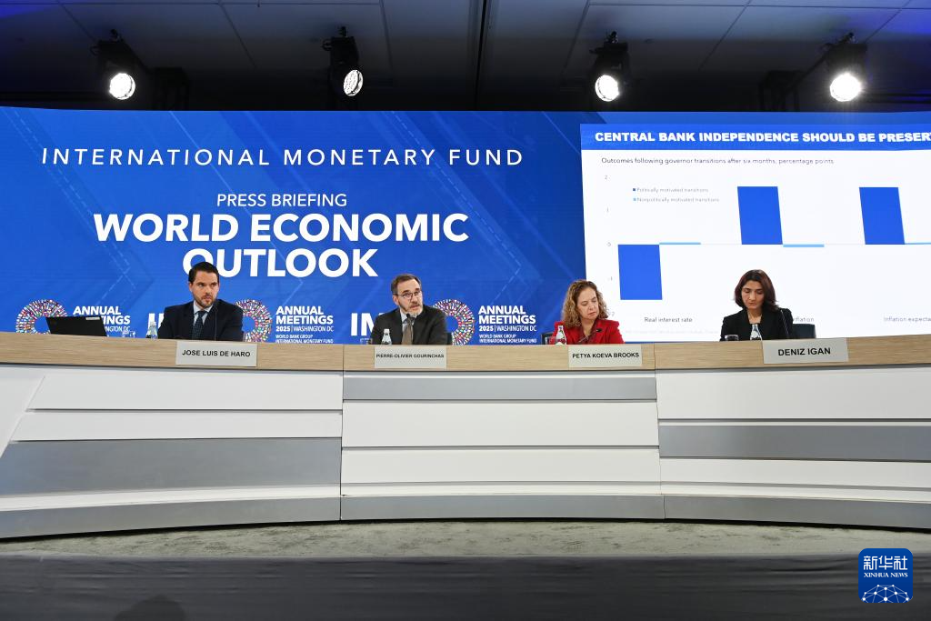 10月14日,在美國華盛頓,國際貨幣基金組織首席經(jīng)濟學家皮埃爾-奧利維耶·古蘭沙(左二)在《世界經(jīng)濟展望報告》新聞發(fā)布會上講話。新華社記者 李睿 攝