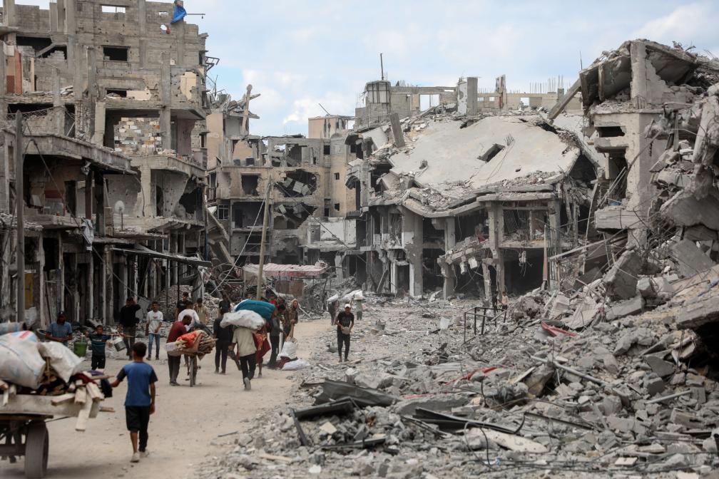 10月12日,在加沙地帶南部汗尤尼斯,重返家園的巴勒斯坦人走過嚴重受損的建筑。新華社發(fā)(里澤克·阿卜杜勒賈瓦德攝)
