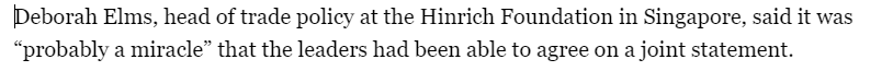 半島電視臺也關注了此次峰會,報道援引新加坡欣里奇基金會貿(mào)易政策負責人黛博拉 埃爾姆斯的話說,各成員領導人能夠就聯(lián)合聲明達成一致是“了不起的事情”。他說,鑒于亞太經(jīng)合組織經(jīng)濟體的不同立場,要將任何達成一致的措辭寫入文件都是一項“充滿挑戰(zhàn)的工作”。