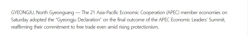 韓國《中央日報》報道稱,《慶州宣言》反映出此次APEC領導人峰會的最終成果,并重申了在保護主義抬頭 的背景下,各成員領導人對自由貿(mào)易的承諾。
