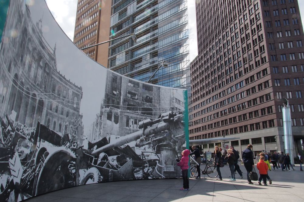 2015年5月1日,人們?cè)诘聡?guó)柏林勃蘭登堡門(mén)前廣場(chǎng)上觀看“戰(zhàn)爭(zhēng)與和平間的日常生活”露天圖片展。(班瑋 攝)