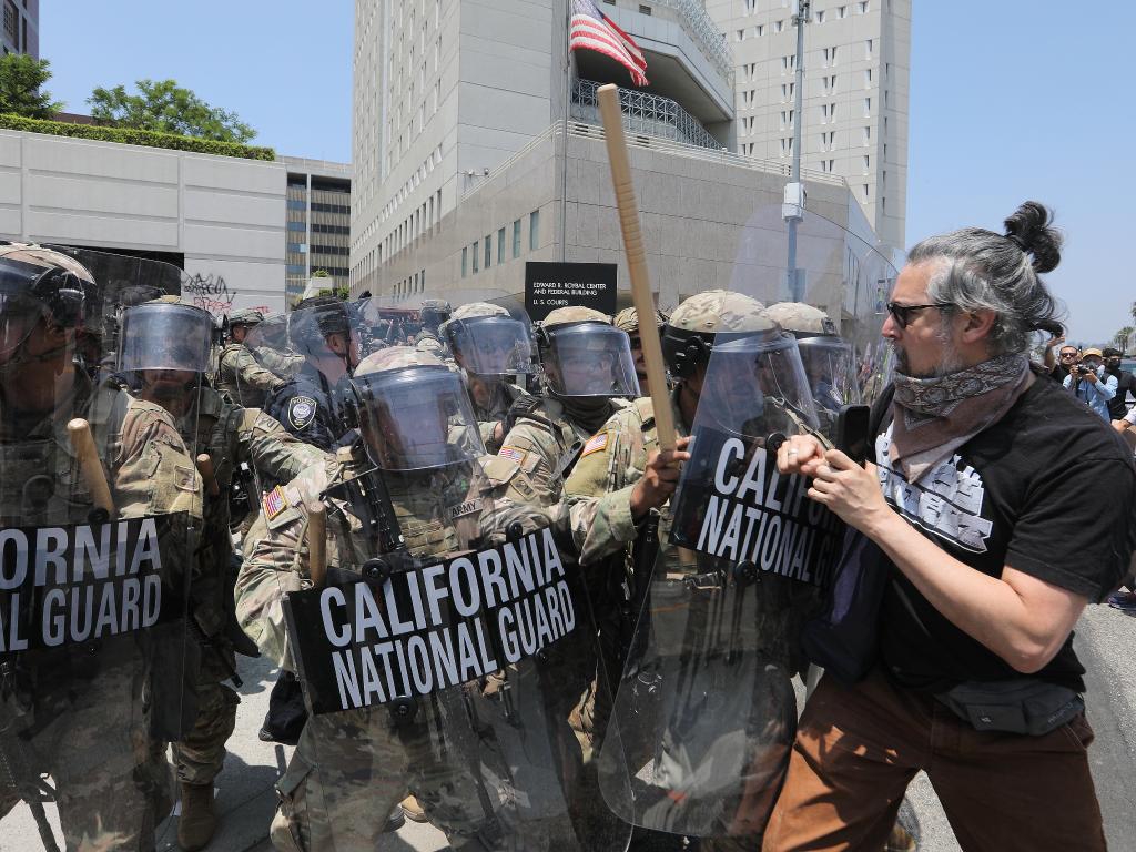 2025年6月8日,在美國(guó)加利福尼亞州洛杉磯市中心的聯(lián)邦執(zhí)法機(jī)構(gòu)門前,抗議者與國(guó)民警衛(wèi)隊(duì)人員發(fā)生沖突。新華社發(fā)(邱晨攝)