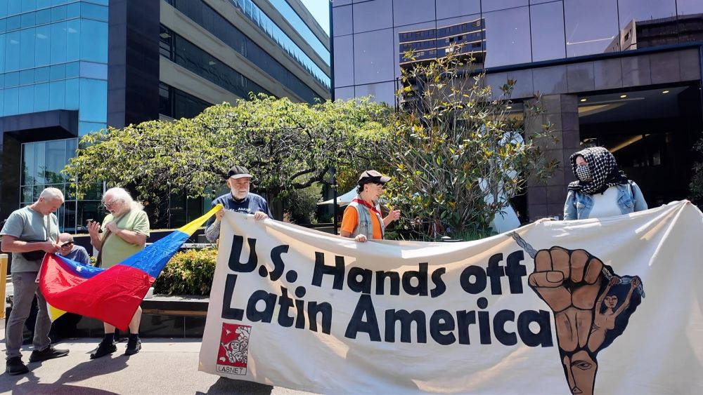 1月12日,澳大利亞墨爾本民眾在美國(guó)駐墨爾本總領(lǐng)事館門(mén)口舉行抗議活動(dòng)??棺h者手持委內(nèi)瑞拉國(guó)旗以及寫(xiě)有“美國(guó)停止干涉委內(nèi)瑞拉”字樣的旗幟,反對(duì)美國(guó)對(duì)委內(nèi)瑞拉的軍事行動(dòng)。