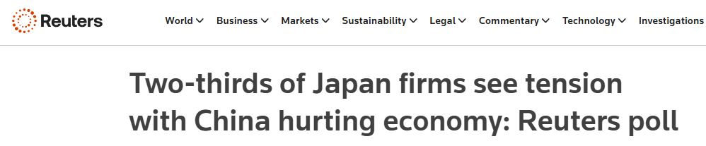 路透社1月15日公布的一項(xiàng)調(diào)查顯示,超過三分之二的日本企業(yè)預(yù)計(jì),日中關(guān)系緊張將對(duì)日本經(jīng)濟(jì)造成沖擊,近一半企業(yè)已經(jīng)感受到或預(yù)計(jì)將面臨直接的經(jīng)營沖擊。