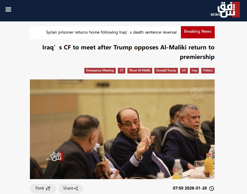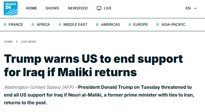 美國總統(tǒng)特朗普當(dāng)?shù)貢r間1月27日在社交媒體發(fā)文稱,如果伊拉克前總理努里·馬利基再度當(dāng)選總理,美國將不再“援助”伊拉克。