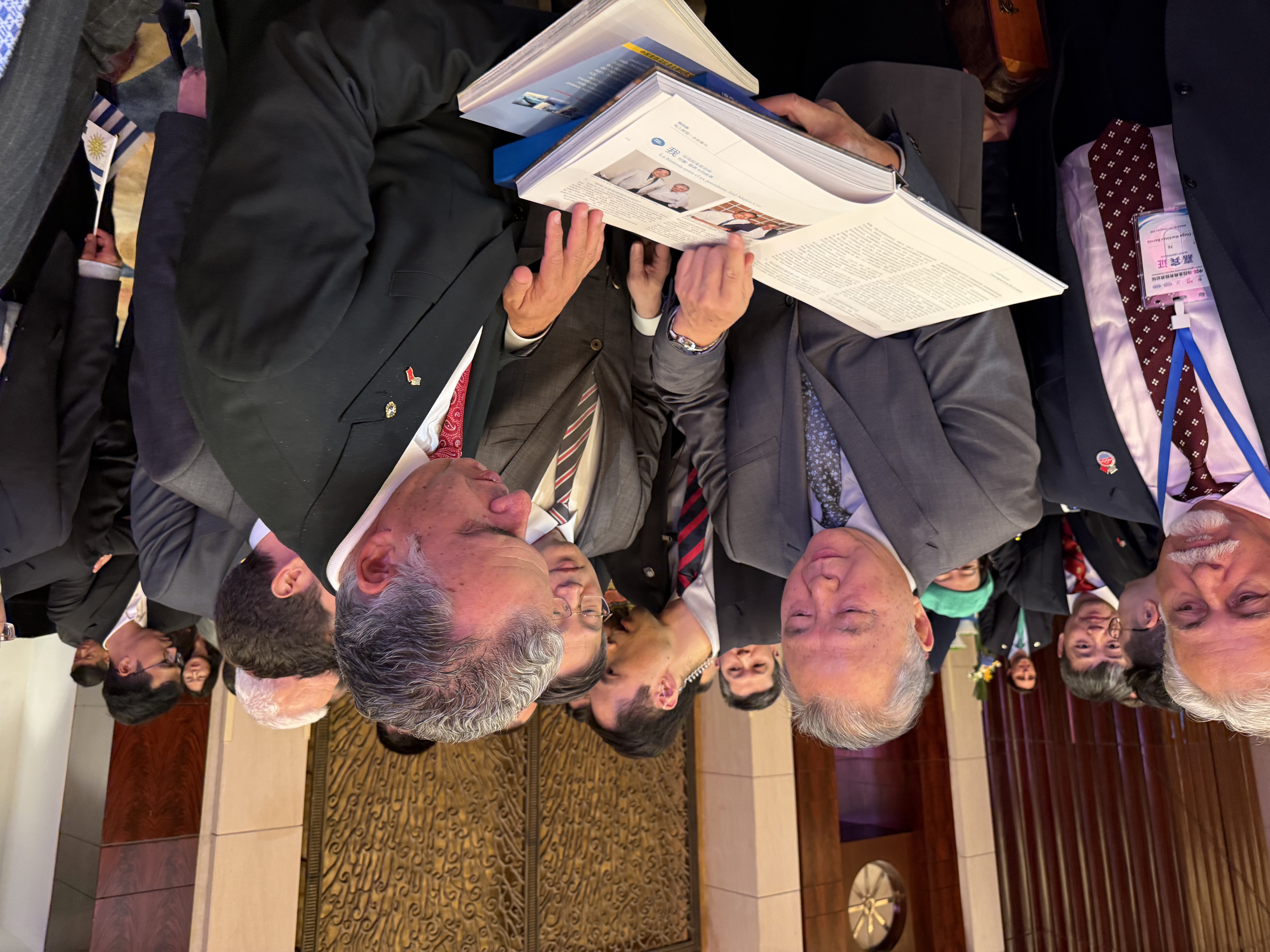 2026年2月6日,余熙(左)受邀出席烏拉圭總統(tǒng)亞曼杜·奧爾西在上海舉行的招待會活動。圖為中國駐烏拉圭大使黃亞中(中)與烏拉圭總統(tǒng)翻閱兩部烏拉圭主題著作。 烏拉圭駐華大使館供圖