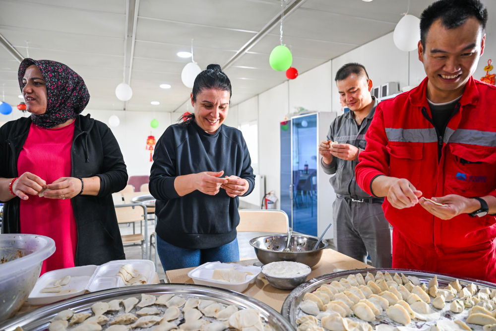 2月16日,在土耳其阿克薩拉伊省圖茲湖地下天然氣儲庫擴建項目二期工程營地,中土兩國職工在一起包餃子。新華社記者劉磊攝