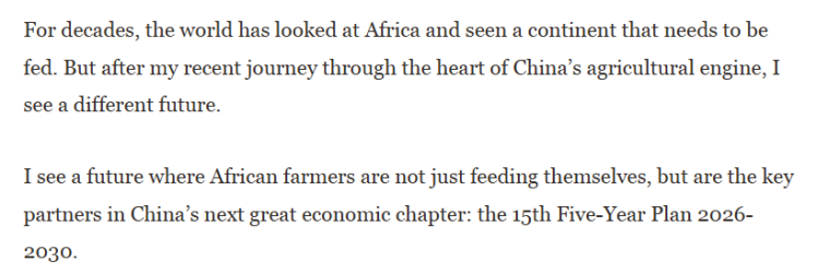 作者在探訪中國河南后撰文說,數(shù)十年來,世界看待非洲的目光始終聚焦于“饑餓大陸”的標(biāo)簽。但當(dāng)我穿越中國農(nóng)業(yè)核心地帶后,一個截然不同的未來圖景正在浮現(xiàn)——非洲農(nóng)民不僅能夠?qū)崿F(xiàn)糧食自給,更將成為中國“十五五”藍(lán)圖中至關(guān)重要的戰(zhàn)略伙伴。
