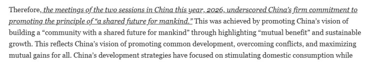 文章總結(jié)說,2026年中國兩會彰顯了中國堅定推動構(gòu)建人類命運共同體原則的承諾。通過強調(diào)"互利共贏"和可持續(xù)增長,推動構(gòu)建人類命運共同體的愿景。這體現(xiàn)了中國推動共同發(fā)展、化解沖突、實現(xiàn)各方利益最大化的理念。