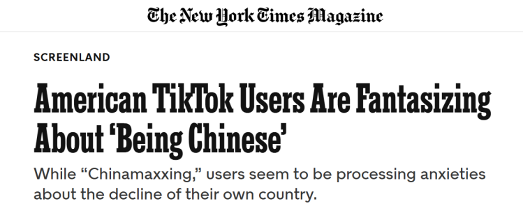 美國(guó)《紐約時(shí)報(bào)》日前刊文稱,“Becoming Chinese”(“成為中國(guó)人”)“Chinamaxxing”(“極致中國(guó)化”)等話題在海外社交媒體上火爆異常,大量網(wǎng)友模仿并表示自己愛上了中國(guó)人的生活方式。文章認(rèn)為,電動(dòng)汽車、醫(yī)療保障、高速鐵路,這些先進(jìn)事物逐漸揭開了中國(guó)生活的神秘面紗,也讓中國(guó)成為新一代旅游勝地——一個(gè)兼具超凡脫俗的自然風(fēng)光與現(xiàn)代科技的神奇的地方。在“極致中國(guó)化”體驗(yàn)過程中,西方網(wǎng)友們似乎在消化對(duì)本國(guó)衰落的焦慮情緒,美國(guó)民眾們仿佛能從這些視頻片段中看到一種尚未在本土實(shí)現(xiàn)的未來(lái)圖景,在他們看來(lái),中國(guó)人高品質(zhì)、低成本的生活,穿著拖鞋、滋養(yǎng)脾胃的日常,應(yīng)是人人都能享有的生活常態(tài)。