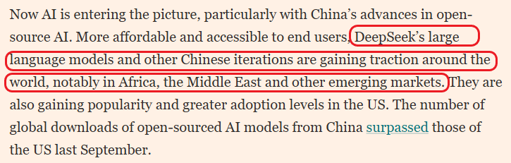 在人工智能領(lǐng)域,文章提到,以DeepSeek為代表的中國開源大模型正不斷擴大海外影響力。憑借更低的成本與更易獲取的使用門檻,中國大語言模型在非洲、中東等新興市場受到廣泛關(guān)注。文章稱,相關(guān)模型應(yīng)用增加后,可能進一步帶動預(yù)測性維護、數(shù)據(jù)分析和智慧基礎(chǔ)設(shè)施管理等服務(wù)需求,從而對知識密集型服務(wù)出口形成支撐。