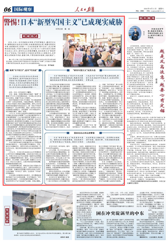 日本“新型軍國主義”的危害顯而易見,國際社會必須高度警惕,堅決抵制日本“新型軍國主義”的妄動。敦促日方深刻反省軍國主義侵略歷史,在軍事安全領域恪守承諾、慎重行事,不要在錯誤的道路上越走越遠
