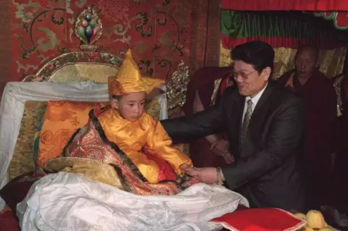 圖為第十一世班禪在國務(wù)院代表、國務(wù)委員李鐵映照護(hù)下坐床 來源:新華社