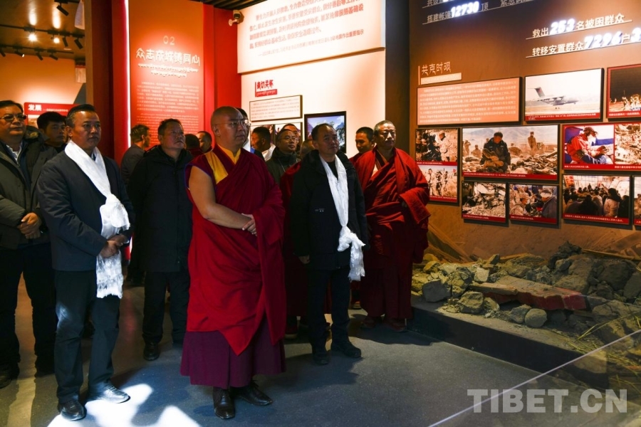 圖為第十一世班禪額爾德尼·確吉杰布在定日縣6.8級地震受災(zāi)影響最嚴(yán)重的村莊之一森嘎村村史館調(diào)研災(zāi)后重建情況 攝影:趙振宇