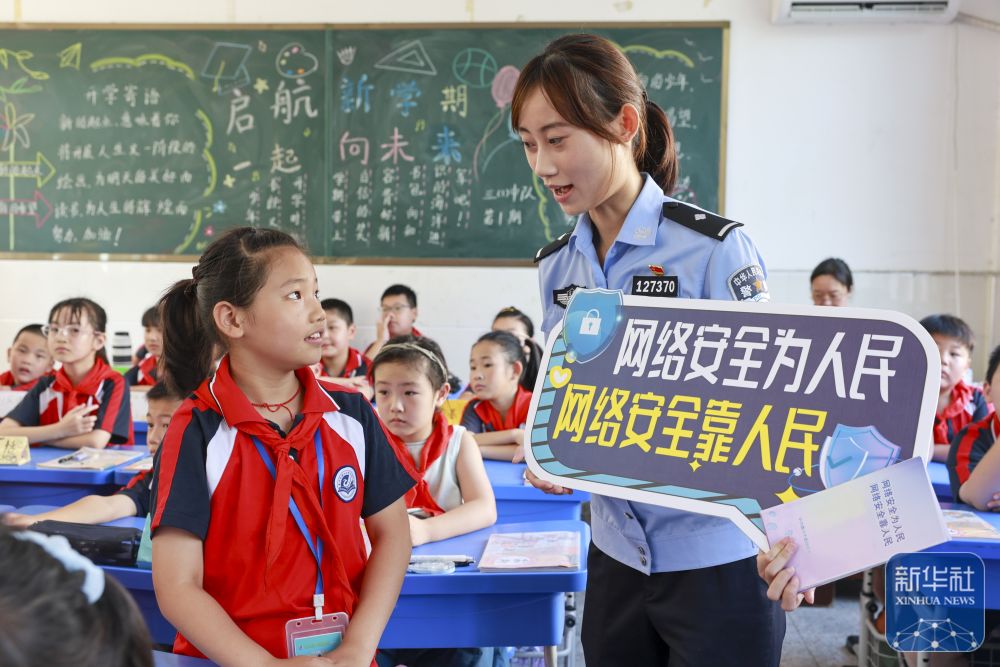 9月15日,民警在天津市濱海新區(qū)塘沽實驗小學(xué)為學(xué)生講解網(wǎng)絡(luò)安全知識。新華社發(fā)(杜鵬輝攝)