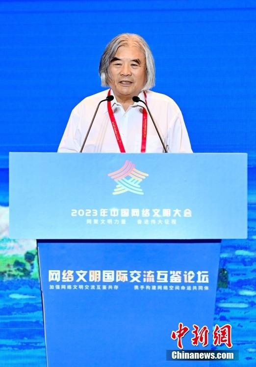 7月18日,2023年中國網(wǎng)絡(luò)文明大會網(wǎng)絡(luò)文明國際交流互鑒論壇在廈門舉辦。中外嘉賓圍繞加強網(wǎng)絡(luò)文明交流、互鑒、共存等話題展開探討。圖為光明日報社原副總編輯、浙大城市學院文明與傳播研究院研究員沈衛(wèi)星作主題演講。中新社記者 王東明 攝