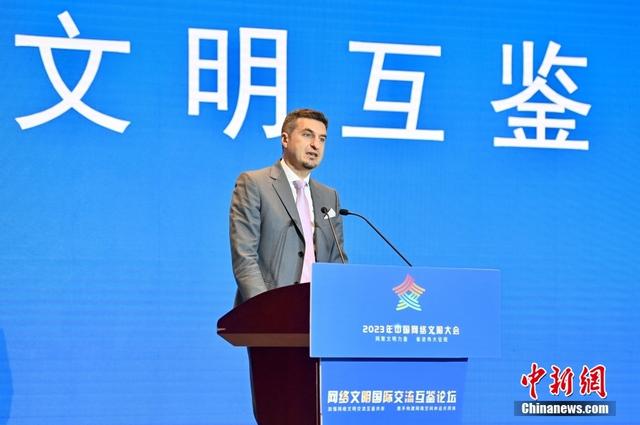 7月18日,2023年中國網(wǎng)絡(luò)文明大會網(wǎng)絡(luò)文明國際交流互鑒論壇在廈門舉辦。中外嘉賓圍繞加強網(wǎng)絡(luò)文明交流、互鑒、共存等話題展開探討。圖為中國—阿拉伯國家博覽會顧問委員會委員肖克作主題演講。中新社記者 王東明 攝
