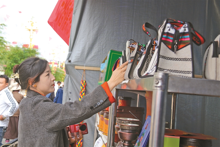 圖為曲松縣農(nóng)產(chǎn)品展銷(xiāo)活動(dòng)中,具有當(dāng)?shù)靥厣氖止ぞ幙棶a(chǎn)品深受青睞。記者 丹增平措 攝