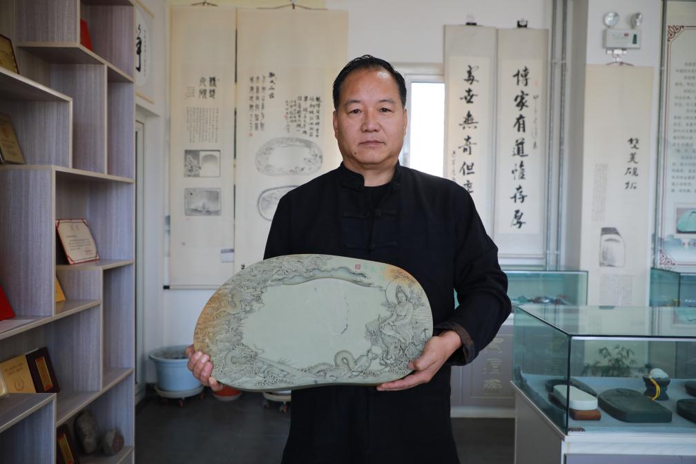 洪緒龍向記者展示自己的洮硯作品。新華社記者梁軍 攝