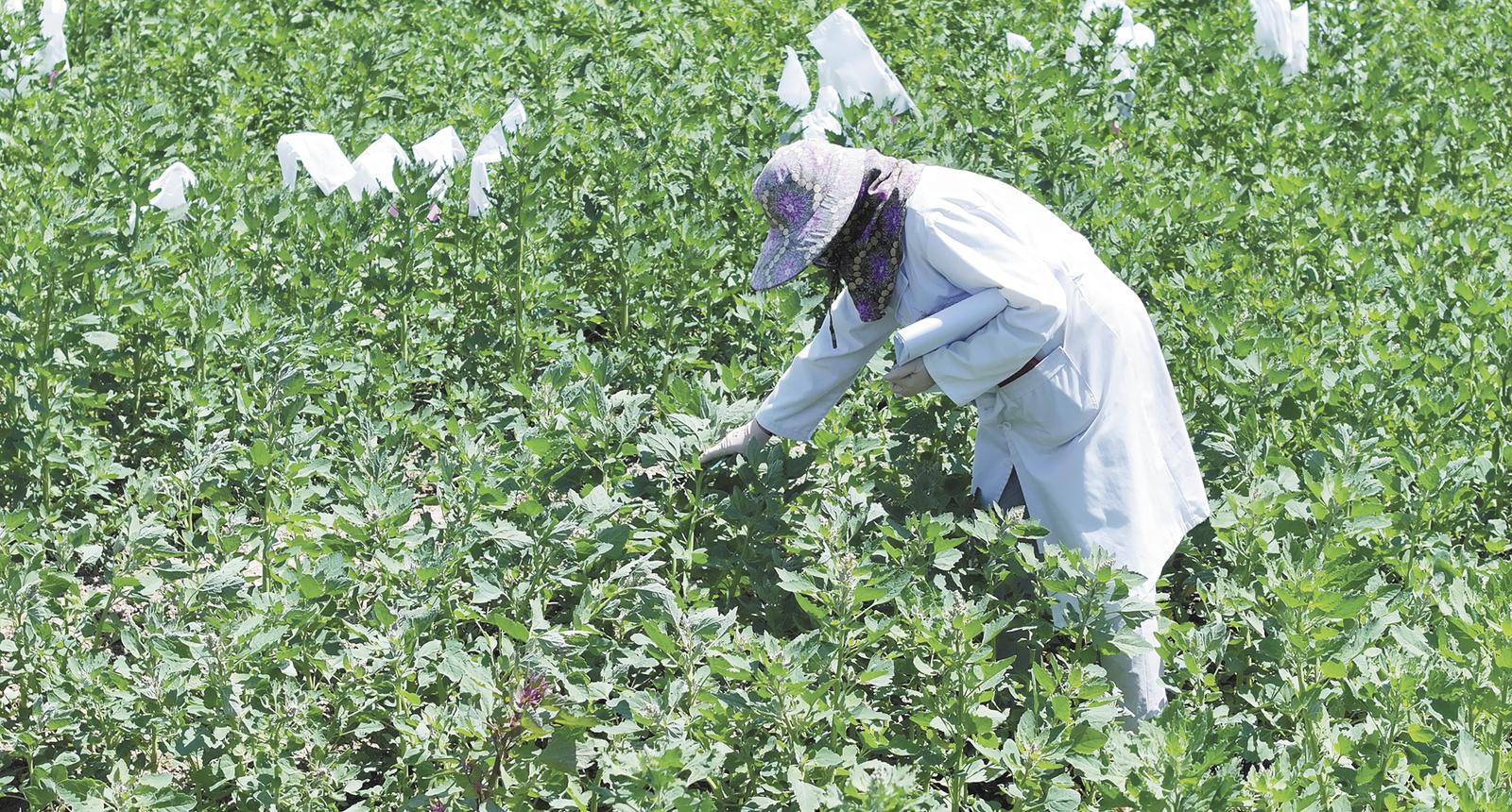 劉洋在田間查看植物長勢情況。圖片由植物新品種測試(西寧)分中心提供