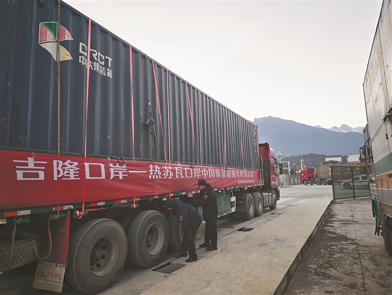 近日,兩輛滿載貨物的中國集裝箱式貨車在拉薩海關所屬吉隆海關監(jiān)管下順利通關,駛向尼泊爾。這是西藏首次實現(xiàn)中國集裝箱式貨車跨境運輸,標志著中尼國際道路運輸便利化水平邁上新臺階。