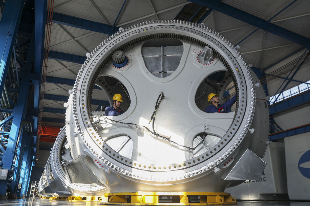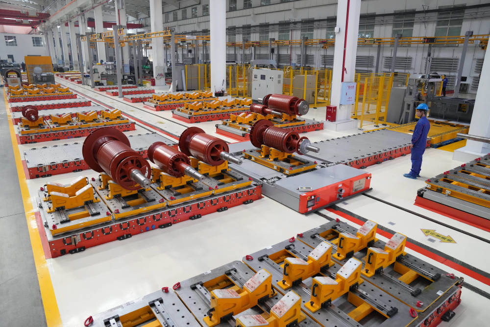 2024年3月5日,在位于黑龍江省齊齊哈爾市的中國一重集團有限公司風電裝備生產制造廠生產車間,工作人員在組裝設備。新華社記者 張濤 攝