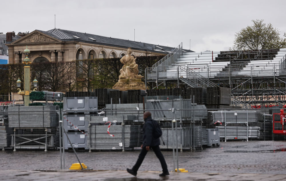 4月2日,行人經(jīng)過法國巴黎協(xié)和廣場的奧運(yùn)比賽場地和看臺(tái)建設(shè)工地。新華社記者 高靜 攝