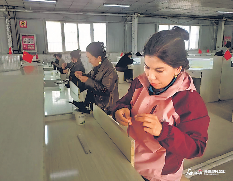 英吉沙縣誠(chéng)朗針織有限公司工人正加緊生產(chǎn)假睫毛。玉蘇普江·艾比卜拉攝