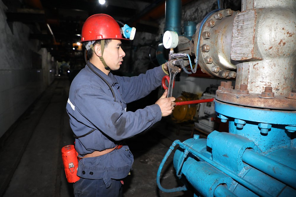 2024年4月30日,冀中能源峰峰集團(tuán)新屯礦機(jī)電區(qū)副區(qū)長(zhǎng)顧博在井下泵房檢修水泵。新華社發(fā)