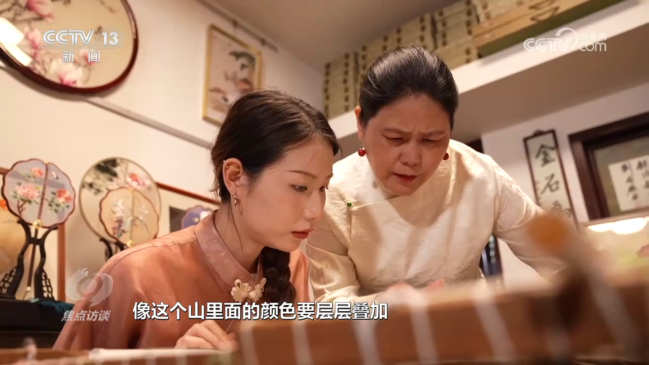 盧建英是蘇州當(dāng)?shù)赜忻奶K繡代表性傳承人。記者見到她的時候,她正在指導(dǎo)女兒刺繡。
