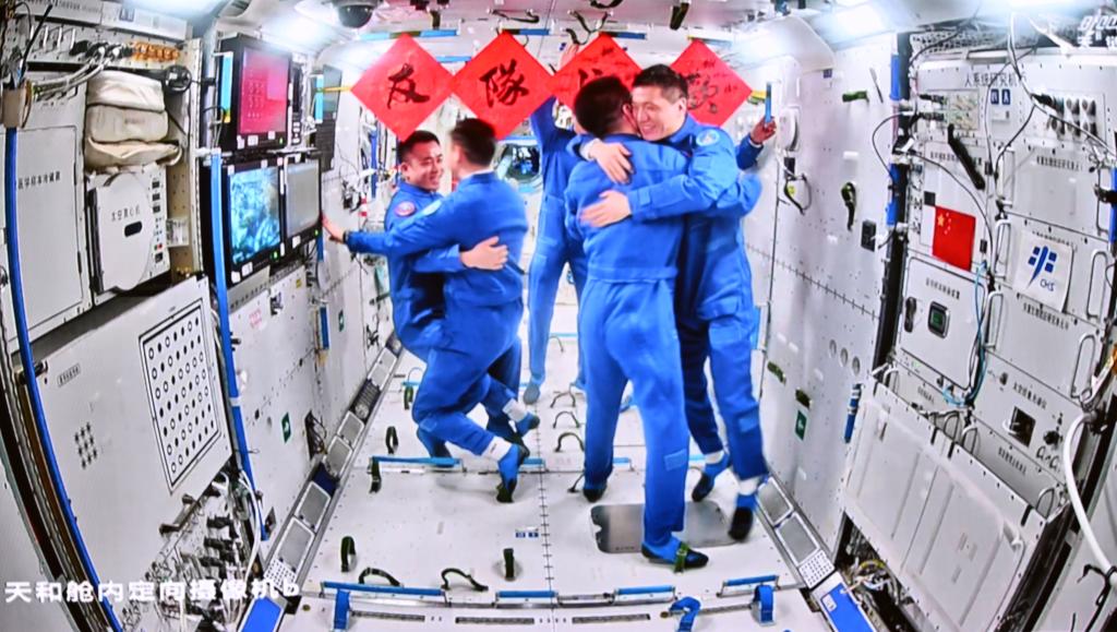 2024年4月26日5時(shí)04分,在軌執(zhí)行任務(wù)的神舟十七號航天員乘組順利打開“家門”,歡迎遠(yuǎn)道而來的神舟十八號航天員乘組入駐“天宮”。隨后,兩個(gè)航天員乘組拍下“全家?!?,共同向牽掛他們的全國人民報(bào)平安。