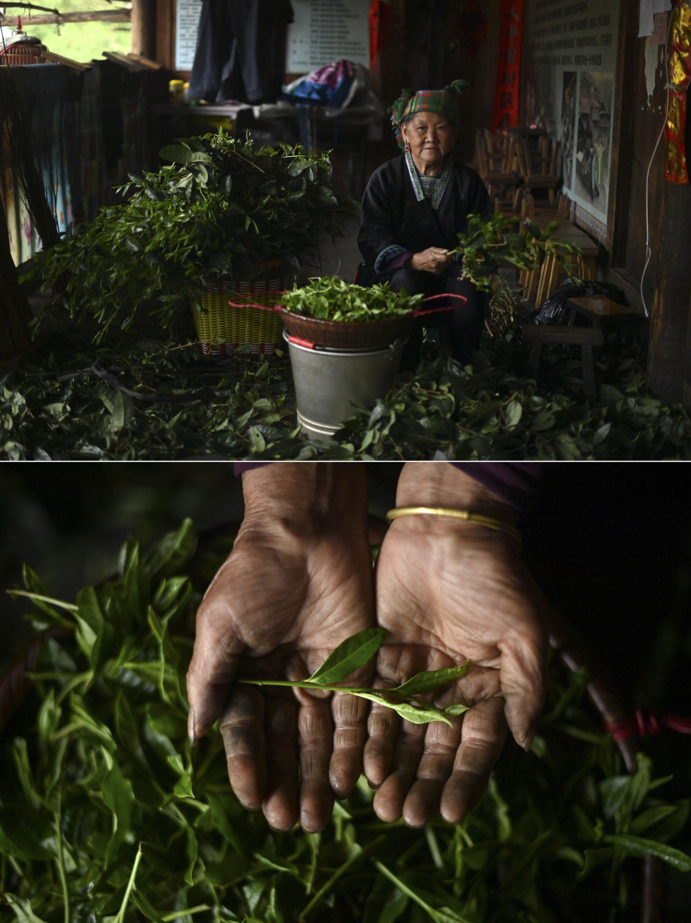 在廣西柳州市融水苗族自治縣桿洞鄉(xiāng)黨鳩村,72歲的梁妹花老人在整理剛剛采摘的茶葉(4月11日攝)。油茶是當(dāng)?shù)氐膫鹘y(tǒng)飲品,梁妹花每天都要打油茶。