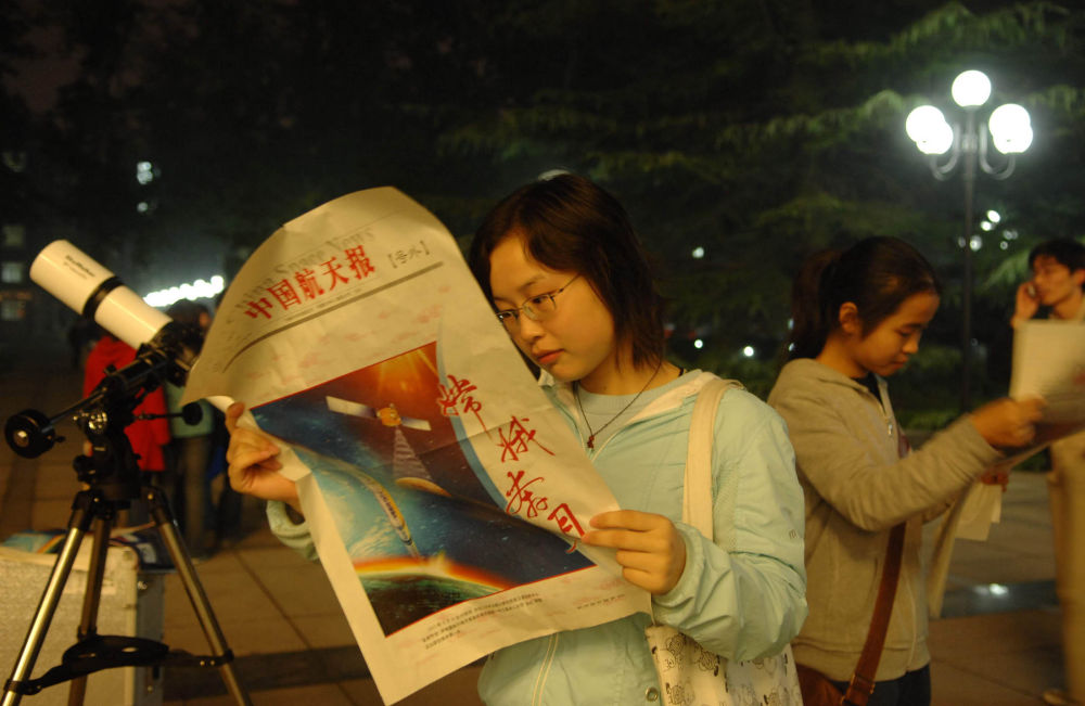 2007年10月24日,北京航空航天大學(xué)一名學(xué)生在翻看《中國航天報(bào)》號(hào)外。新華社記者 羅曉光 攝