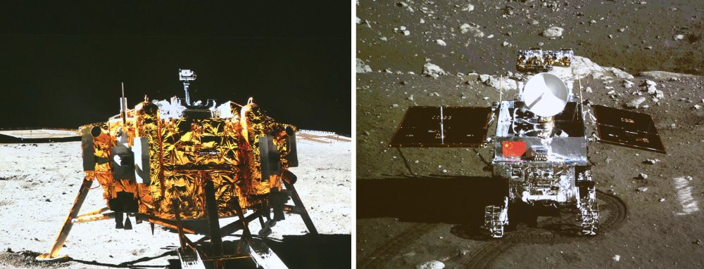 2019年1月11日下午,嫦娥四號(hào)著陸器與玉兔二號(hào)巡視器工作正常,在“鵲橋”中繼星支持下順利完成互拍(拼版照片)。新華社發(fā)(國家航天局供圖)