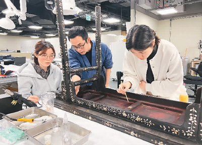 京港修復(fù)師共同為明代黑漆嵌螺鈿桌案進(jìn)行“會(huì)診”?!∠愀酃蕦m文化博物館供圖