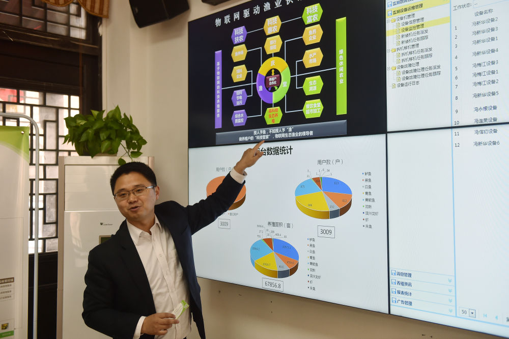 “漁博士”沈杰在浙江省湖州市菱湖鎮(zhèn)創(chuàng)辦的公司內(nèi)介紹匯集養(yǎng)殖戶(hù)、飼料廠商、銷(xiāo)售檔口、金融機(jī)構(gòu)等相關(guān)方的物聯(lián)網(wǎng)平臺(tái)(資料照片)。