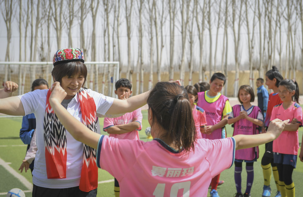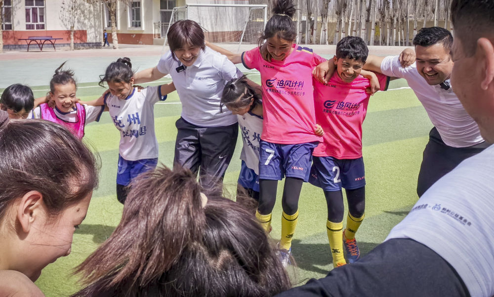 足球賽奪冠,不是第一次了,學(xué)校已經(jīng)連續(xù)多年蟬聯(lián)阿克陶縣校園聯(lián)賽女子組冠軍,連縣城賣(mài)馕的大叔都知道,且克村小學(xué)的女足很厲害。但這一次有點(diǎn)不一樣,是因?yàn)閮杉虑橹械牧硪患?,是中?guó)女足前主教練水慶霞要來(lái)看她們的比賽,帶她們訓(xùn)練。