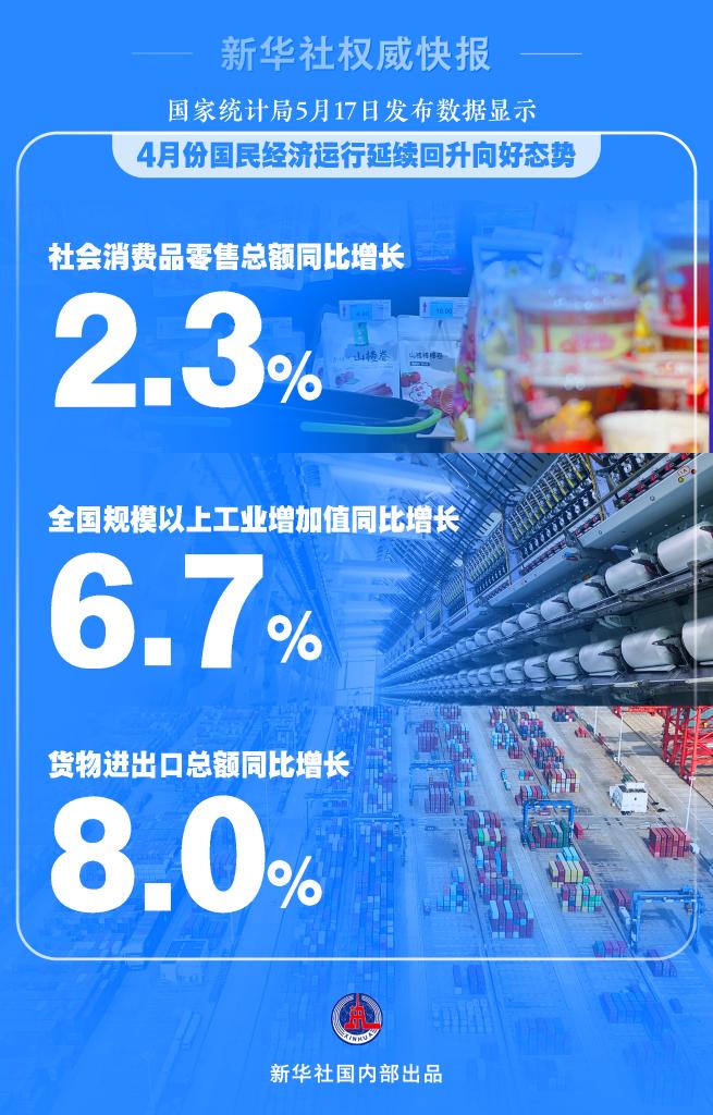 “總的來(lái)看,4月份國(guó)民經(jīng)濟(jì)運(yùn)行平穩(wěn),雖然部分指標(biāo)受節(jié)假日錯(cuò)月、上年同期基數(shù)較高等因素影響增速有所放緩,但工業(yè)、出口、就業(yè)、物價(jià)等主要指標(biāo)總體改善,新動(dòng)能保持較快成長(zhǎng),國(guó)民經(jīng)濟(jì)延續(xù)回升向好態(tài)勢(shì),積極因素累積增多?!眹?guó)家統(tǒng)計(jì)局新聞發(fā)言人劉愛(ài)華在當(dāng)日舉行的國(guó)新辦發(fā)布會(huì)上說(shuō)。