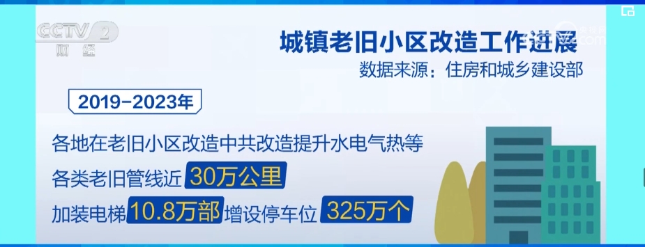數(shù)據(jù)顯示,2019年—2023年,全國累計開工改造老舊小區(qū)22萬個,惠及居民3800多萬戶、近1億人。各地在老舊小區(qū)改造中,共改造提升水電氣熱等各類老舊管線近30萬公里,加裝電梯10.8萬部,增設停車位325萬個、電動汽車充電樁10.4萬個、電動自行車充電樁68萬個,增設養(yǎng)老托育等各類社區(qū)服務設施6.8萬個。